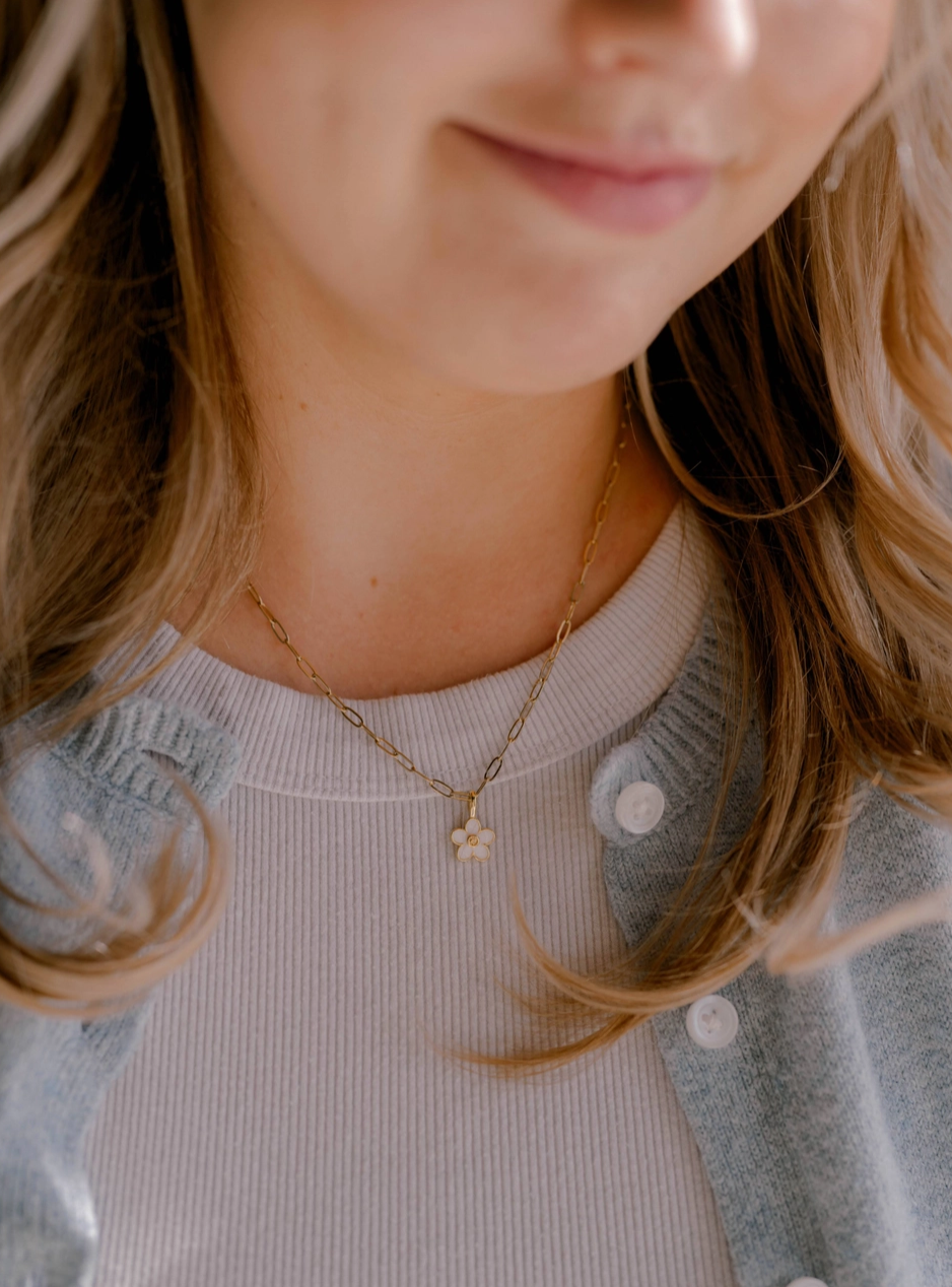 Details: Flower Charm on a 16-18" mini paperclip chain