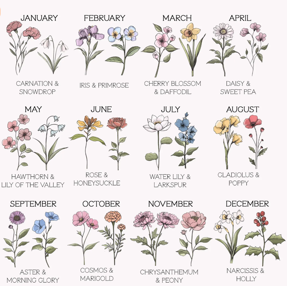 PLEASE LEAVE DESIRED FLOWER/FLOWERS and BIRTH MONTHS at the note in checkout! We are able to do up to 6 flowers on these.