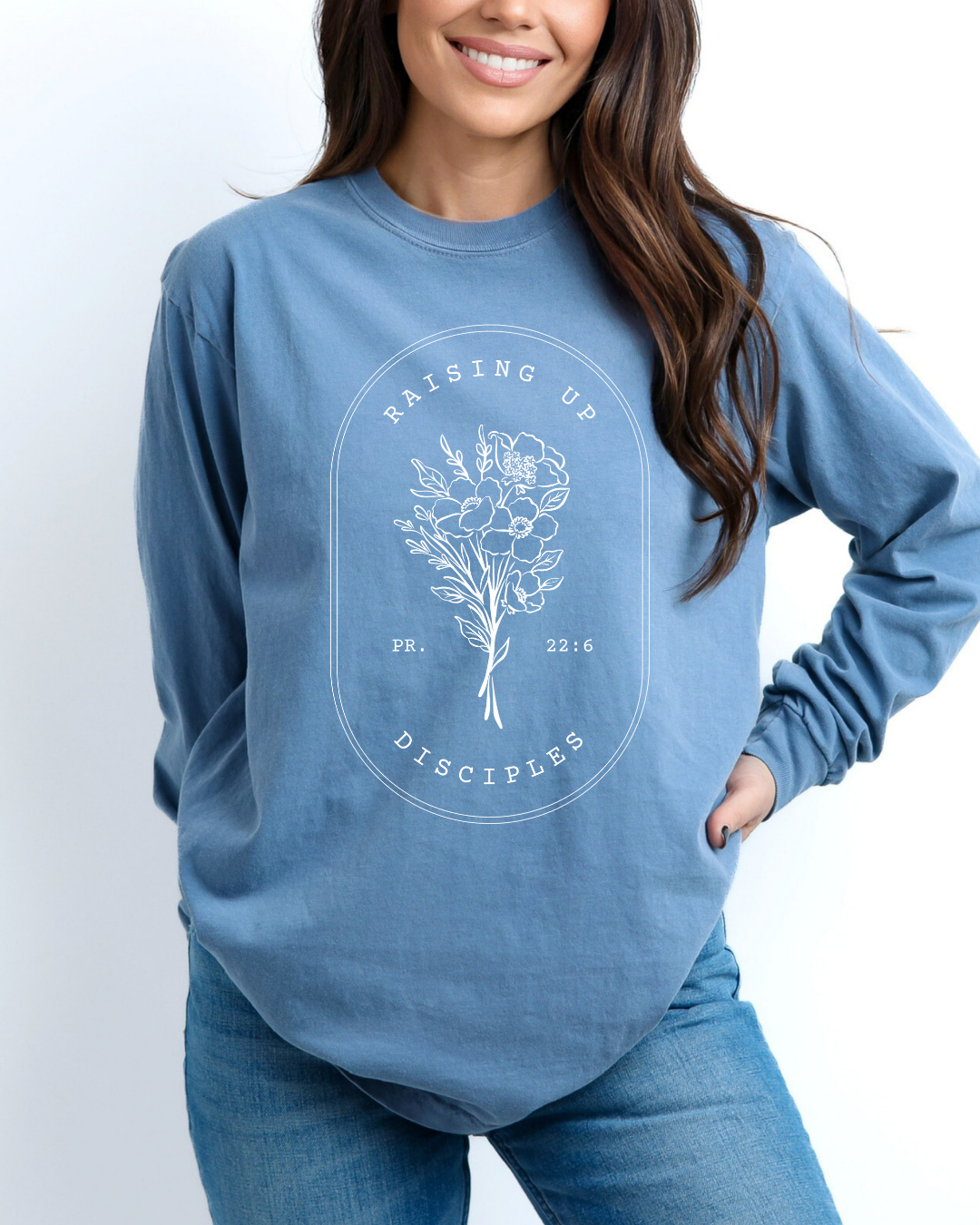 Printed on a high quality, soft and comfortable, preshrunk 100% cotton t-shirt in WASHED DENIM/IVORY. Sweatshirt in Slate Blue/Ivory.